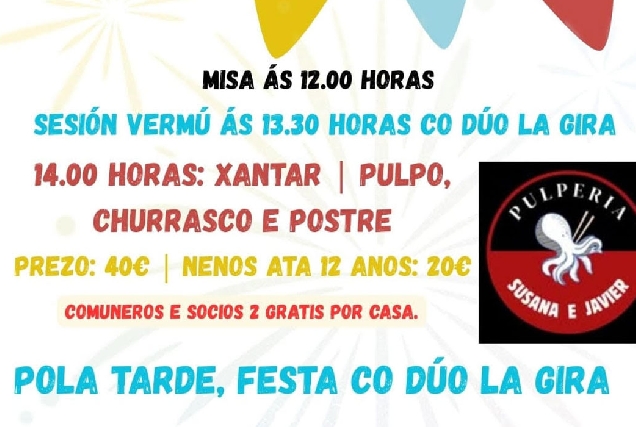 A las 14:00 horas se celebrará la comida, que incluirá pulpo, churrasco y postre